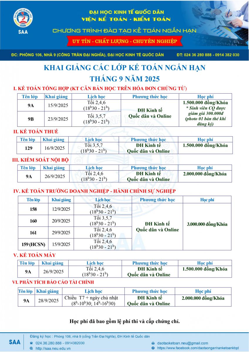 LỊCH KHAI GIẢNG CÁC KHOÁ KẾ TOÁN NGẮN HẠN THÁNG 9/2025